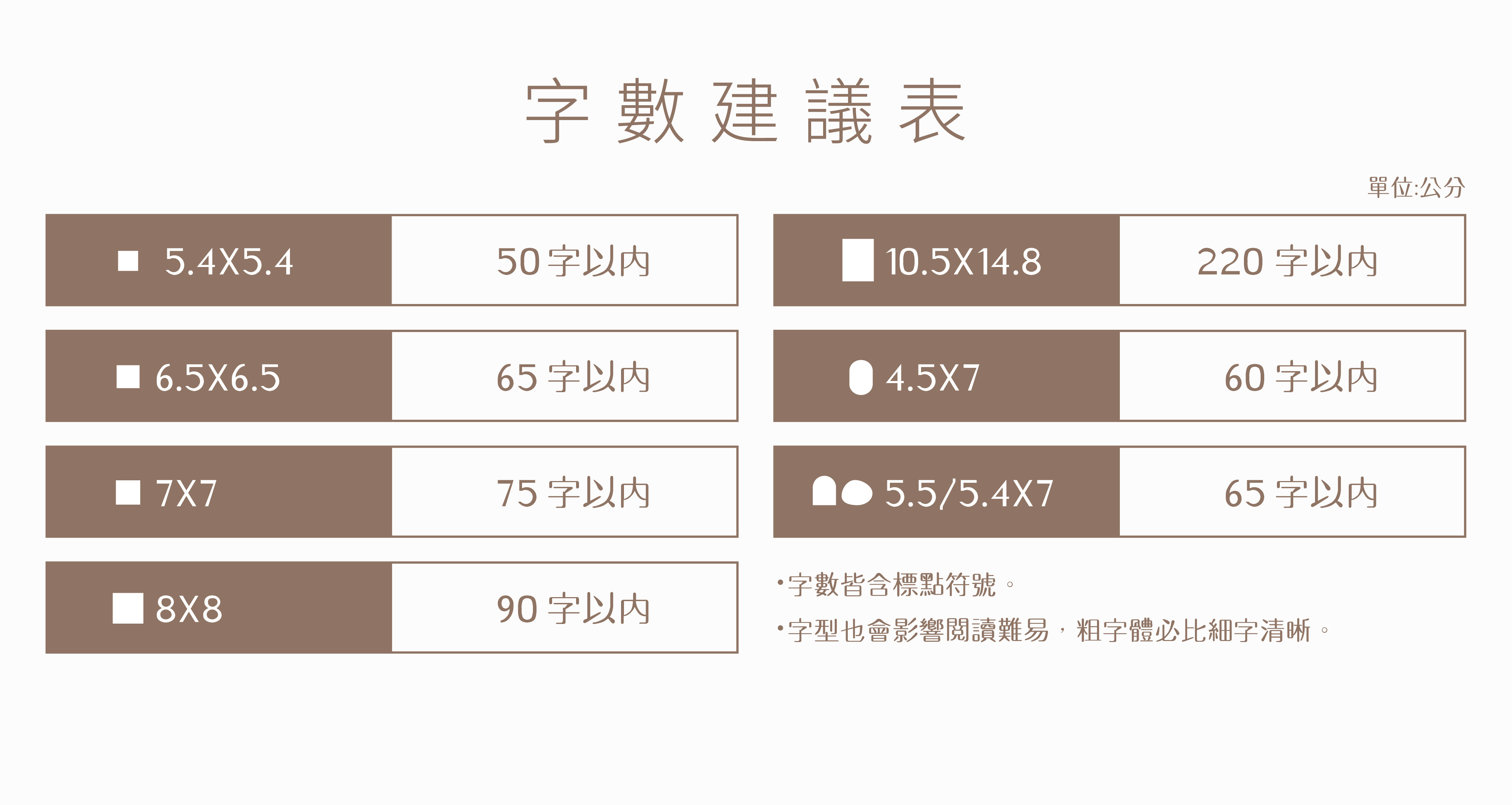 (2)購買前請先務必確認『尺寸大小』,可參考字數建議表格再進行下單
